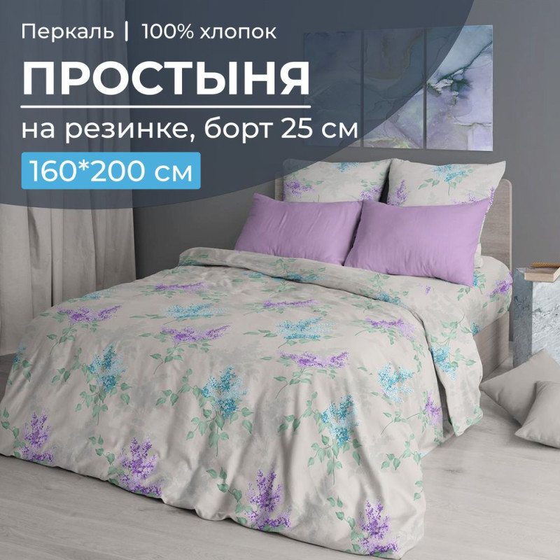 Простыня 160х200 на резинке перкаль Сирень (борт 25 см)