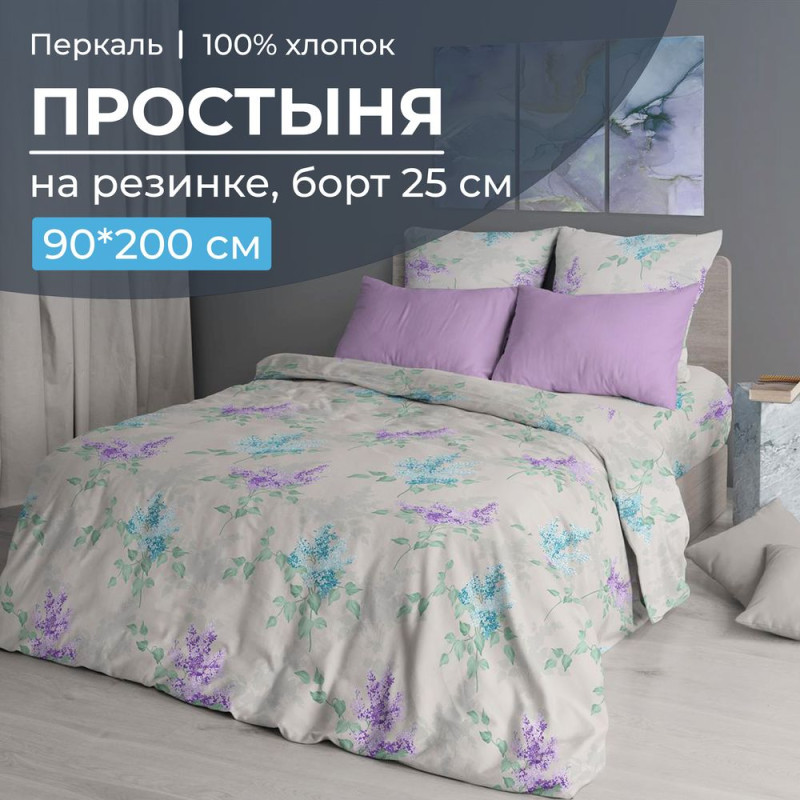 Простыня 90х200 на резинке перкаль Сирень (борт 25 см)
